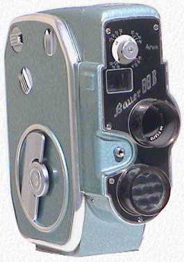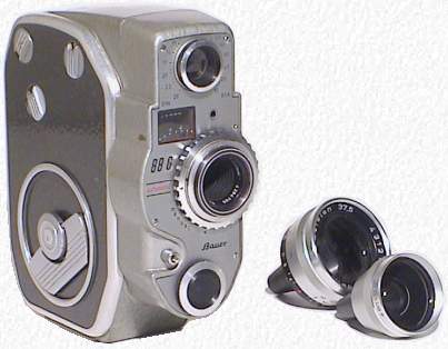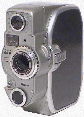 Bauer 88 B, 8mm Kamera gebaut von 1954 - 1960 von Eugen Bauer, Stuttgart. Sehr robuste und handliche Kamera im Ganzmetallgehäuse mit reichhaltiger Ausstattung. Die Kamera verfügt über 4 Gänge. 8-16-24-48 Bilder und Einzelbild. Gekuppelter Belichtungsmesser. Der Federwerkmotor zieht 2 Meter Film durch und verfügt über ein akustisches Ablaufzeichen. 1959 kostete die 88 B mit dem Rodenstock Ronar 1,9/12,5 mm, DM ca. 450.-. Da das Objektiv nicht gewechselt werden kann gab es einen Weitwinkelvorsatz mit 12, 5 mm für DM 116.- sowie zwei Televorsätze mit 25mm für DM 140.- und 37,5mm für DM 170.-. Ausserdem ein Breitbildvorsatz der aus Objektiv und Sucher bestand.