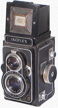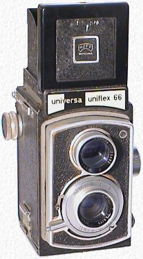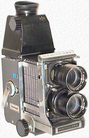 Eine Mamiya C33 die ab 1965 gebaut wurde. Mamiya war der einzige Hersteller einer zweiäugigen Spiegelreflexkamera mit auswechselbaren Objektiven und einem Balgenauszug der extreme Nahaufnahmen zuließ. Nebenstehend eine C33 mit einem 135mm Objektiv und vollem Balgenauszug. Es ist eine sehr robuste aber auch recht schwere Kamera, so ca. 2,3 Kilo hatte man um die Schulter hängen, die dann irgendwann anfing zu schmerzen. Es gab auswechselbare Sucher, Lichtschacht,Lupe oder Porroflexsucher, eine Art Prismensucher mit oder ohne eingebautem Belichtungsmesser. Ebenso gab es auch ein Rückteile für Planfilm. Um einen Paralaxenausgleich bei Nahaufnahem zu ermöglichen gab es im Sucher, abhängig von der Brennweite, einen roten Balken, der immer die obere Bildbegrenzung anzeigte. Dazu gab es dann noch ein Stativaufsatz der die C33 um den Abstand der Objektive zueinander in der Höhe verschiebbar war. Ebenso waren im Sucher Belichtungsverlängsfaktoren angezeigt. Mit der Filmtransportkurbel wurde automatisch der Verschluss gespannt. Es gab Objektive von 55mm bis 250mm. Der Vorgänger fer C33 war die C3, der leichtere Nachfolger der C33 war die C330 die von 1983 bis 1997 gebaut wurde.