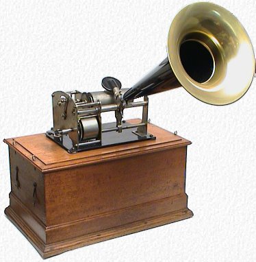 Ein Phonograph von um 1900. Von Thomas A. Edison als Sprechmaschine erfunden. Edison spannte eine Walze auf den Zylinder und brüllte in den Trichter. Die Walze war mit Wachs beschichtet. Ein Metallstift, verbunden mit einer Membran am Ende des Trichters, bewegte sich im Rhythmus der Geräusche und schnitt so in die sich drehende Walze eine Rille mit unterschiedlichen Auslenkungen. Die Wachswalze wurde dann gehärtet und konnte wenige Zeit später auf dem gleichen Gerät wieder abgehört werden. Die Schallaufzeichnung war erfunden . Und dies alles funktionierte ohne Strom und Verstärker, - rein mechanisch. Der Motor des Phonographen war ein Federwerksmotor mit Fliehkraftregler, wie er auch später bei Grammophonen eingesetzt wurde. Die obere Abdeckung mit Mechanik, konnte umgedreht werden, umso das Laufwerk beim Transport zu schützen. Man hatte dann einen kleinen Holzkoffer mit Griff zum transportieren. Der Trichter musste seperat transportiert werden.