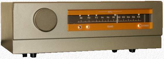 Quad FM4 UKW Tuner. Die kleinen Reiter auf der Skala lassen sich verschieben um bevorzugte Sender anzuzeigen.