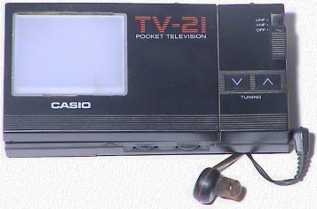 Wahrscheinlich der erste und kleinste LCD Fernseher, ein CASIO TV-21. Ein s/w LCD Fernseher mit einem etwas ungewöhnlichen Konzept. Unter einem weissen Diffusor im Deckel, befindet sich das s/w LCD Display. Klappt man nun den Deckel auf, fällt Licht durch die weisse Scheiben und man sieht auf dem Spiegel das schwarz-weiss Bild. Also ohne Licht kein Bild. Als Antenne dient das Kabel des Ohrhörers. Betrieben wird der Fernseher mit zwei 1,5 Volt Batterien. Er ist so klein, dass er ohne weiteres in die Hemdbrusttasche passt.