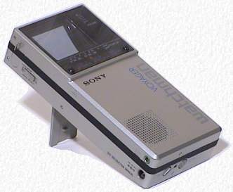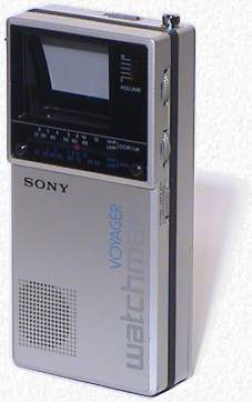 Ein Sony Watchman FD-2E. Ein ganz besonderer kleiner Taschenfernseher. Er besitzt eine kleine s/w Bildröhre, also kein LCD Fernseher. Das besondere ist aber, dass die Bildröhre 'um die Ecke herum projeziert. Die Röhre ist in der Länge des Gehäuses eingebaut und man sieht auf den Bildschirm, der im 45 Grad Winkel innerhalb der Bildröhre sichtbar ist. Die Bildschimdiagonale des gestochenscharfen Bildes beträgt ca. 5cm. Um das Bild bei Bedarf jedoch grösser erscheinen zu lassen, gab es noch einen Fresnellinsen Vorsatz. Die Bildröhrenkonstruktion ist einmalig, und wurde von Sony in einem grösseren Watchman Modell nochmal eingesetzt.
