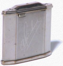 Versilbertes Benzin Tischfeuerzeug. Dem Aussehen nach aus den 40ger Jahren. Drückt man den seitlichen Knopf, spring das Feuerzeug auf. Will man es schliessen kann man sich die Finger verbrennen.